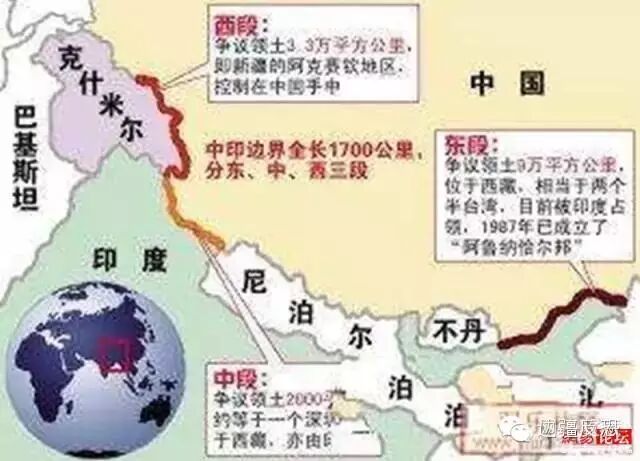 整个中印边界全长1700公里,分东、中、西三段。在每一段边界上都有争议领土。